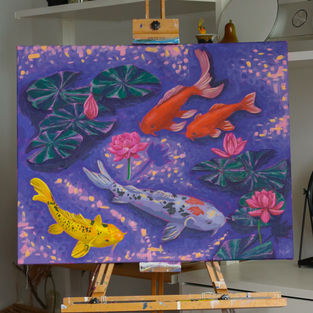 Seven koi fish swim upstream, and the journey of life may lead them through challenging waters where they strengthen and form good relationships with each other, earning the marks of experience. As they navigate the ebbs and flows of the stream, they plunge into deeper shades of blue, emerging renewed and ready for the next journey ahead, together.